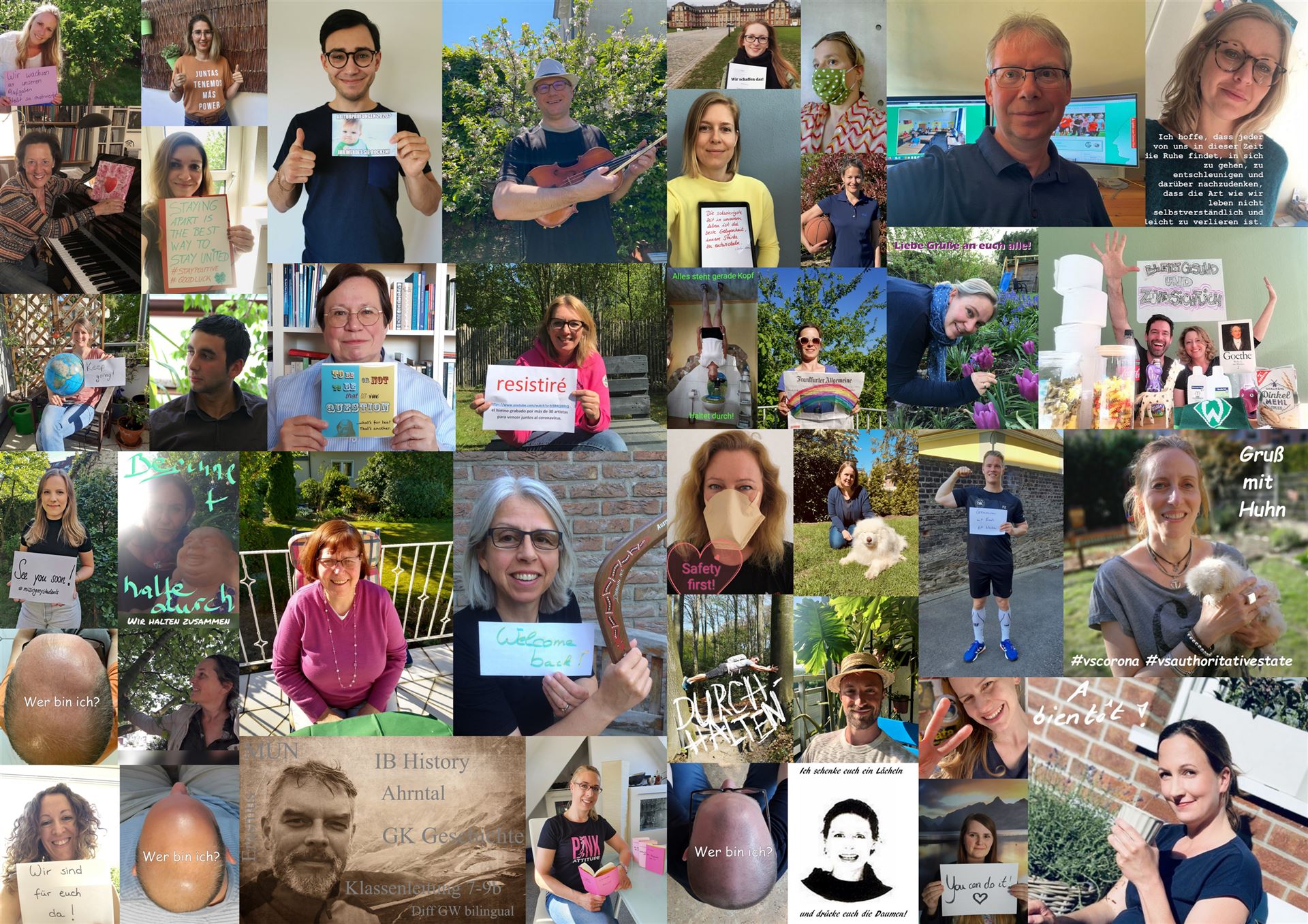 Somit senden wir Zuversicht, Motivation und Kraft allen Schülerinnen und Schülern, allen voran unserer Q2, die ab morgen wieder in die Schule gehen wird, um sich auf das Abitur vorzubereiten (Ihr rockt das Abi - und wir mit euch!!), aber auch allen, die zu Hause über das Lernen auf Distanz mit uns verbunden sind - wir denken an euch und gehen diesen Weg mit euch gemeinsam. Nicht zuletzt allen Eltern, die vermutlich zwischen den ganzen Video-Konferenzen und dem eigenen Home Office hin - und hergerissen sind. Wir alle haben Angst vor der Ungewissheit. Wir stehen zusammen als Team und jeder von uns, von euch und von Ihnen ist ein Teil dieses Teams.