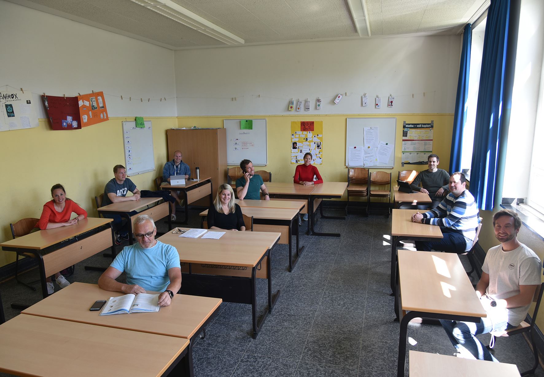 Während der Pausen zwischen den Unterrichtsblöcken bleiben alle Kurse zunächst in ihren Räumen. Während der Pause erfolgt dann der Raumwechsel.