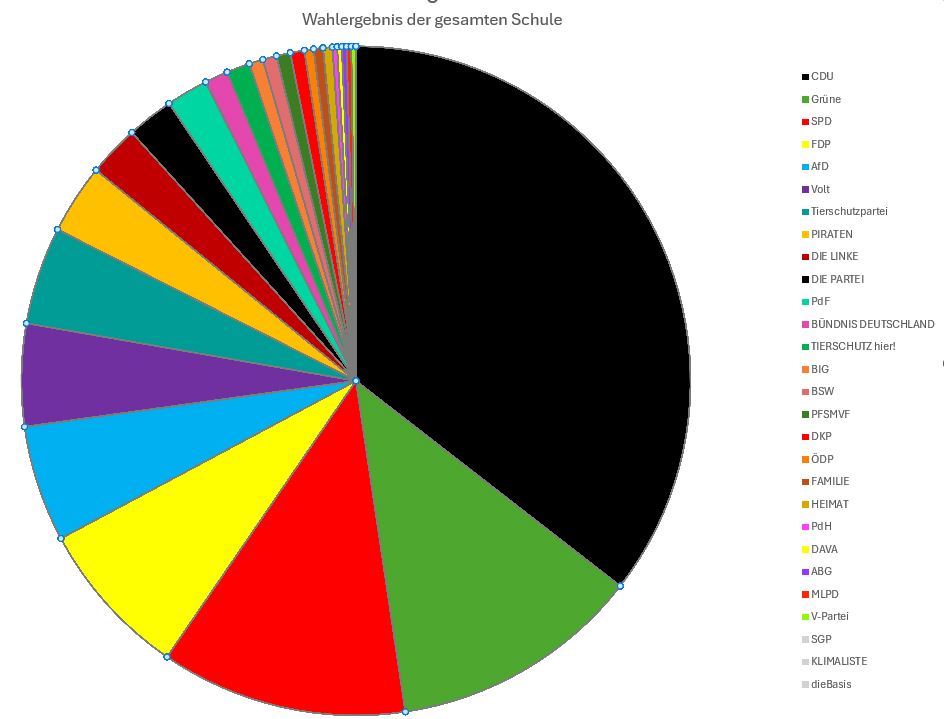 Bei der U16-Wahl an der Goetheschule gibt es dieses Jahr einen sehr klaren Sieger. Die CDU bekommt 35,5% der Stimmen und ist damit mit großem Abstand auf Platz 1. Nach einiger Zeit folgen die Grünen mit 12,1% und die SPD mit 11,9%. Auch die Plätze 4 und 5 liegen sehr nahe beieinander, nämlich die FDP mit 7,6% und die AfD mit 5,6%. Auch folgende Parteien hätten nach Wunsch der Goetheschüler*innen einen Platz im Europaparlament: Volt, die Tierschutzpartei, die Piraten, die LINKE, die Partei, PdF, Bündnis Deutschland, Tierschutz hier, BIG, Bündnis Sahra Wagenknecht, PFSMVF, DKP, ÖDP, FAMILIE, HEIMAT, PdH, DAVA, ABG, MLPD und die V-Partei. Die genauen Wahlergebnisse mit verschiedenen Aufschlüsselungen können dem Diagramm entnommen werden. Das Ergebnis unserer Schule ist nicht deckend mit dem deutschlandweiten Europawahlergebnis. Es gibt einige starke Abweichungen.