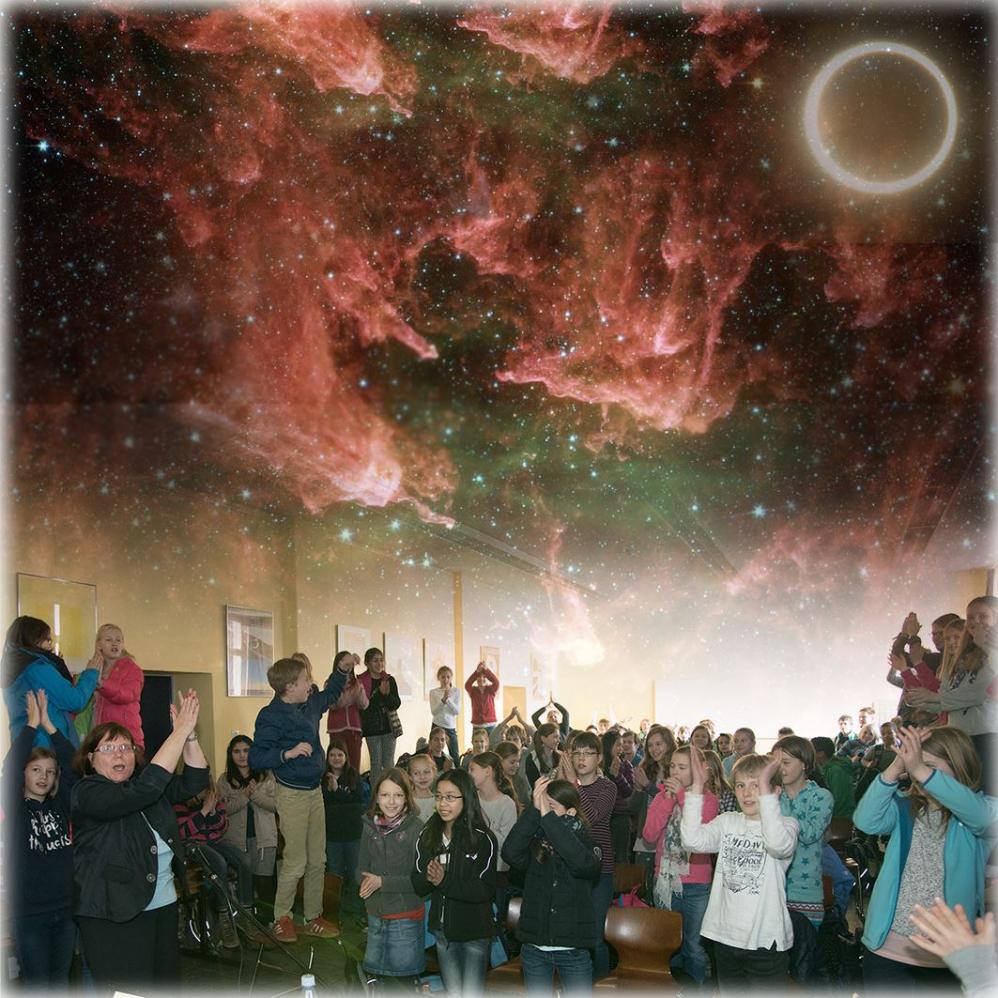 Anders als 1999 konnten wir die Sonnenfinsternis am 20. März leider nicht beobachten. :-( Es war zu neblig. Die Faszination Weltraum :-) wurde jedoch am 18. März deutlich, als Frau Kretschmann vor der Jahrgangsstufe 5 den Vortrag "Outer Space" hielt. Beim Lied "Aquarius" aus Hair war die Begeisterung grenzenlos.