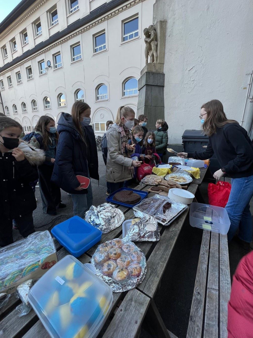 Am Donnerstag, den 10.03.2022 hat die Schülervertretung in den beiden großen Pausen den Verkauf von selbstgebackenem Kuchen und Muffins, sowie Schleifen und Armbändern in weiß, blau und gelb, organisiert.