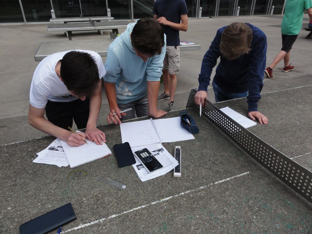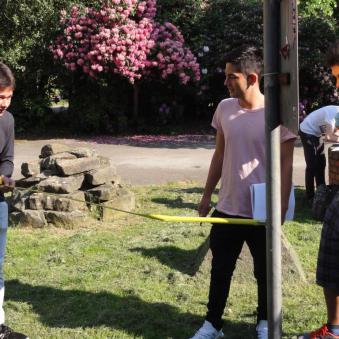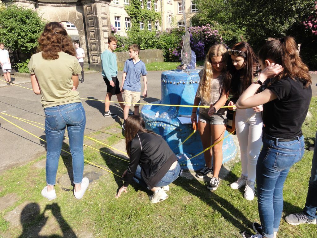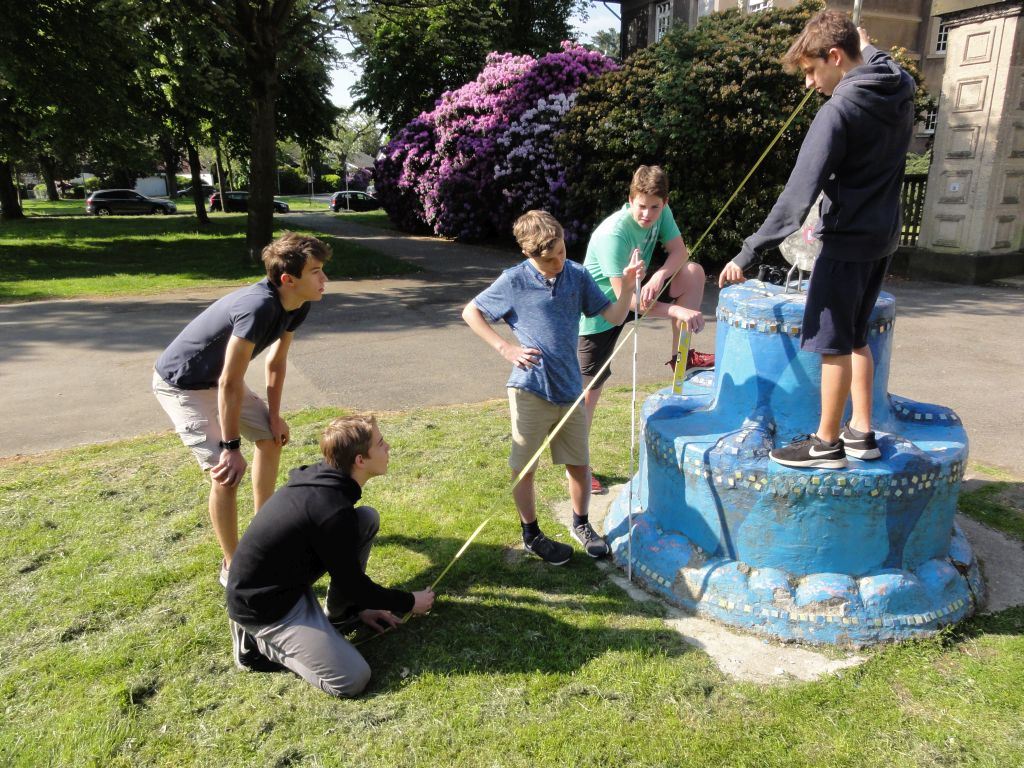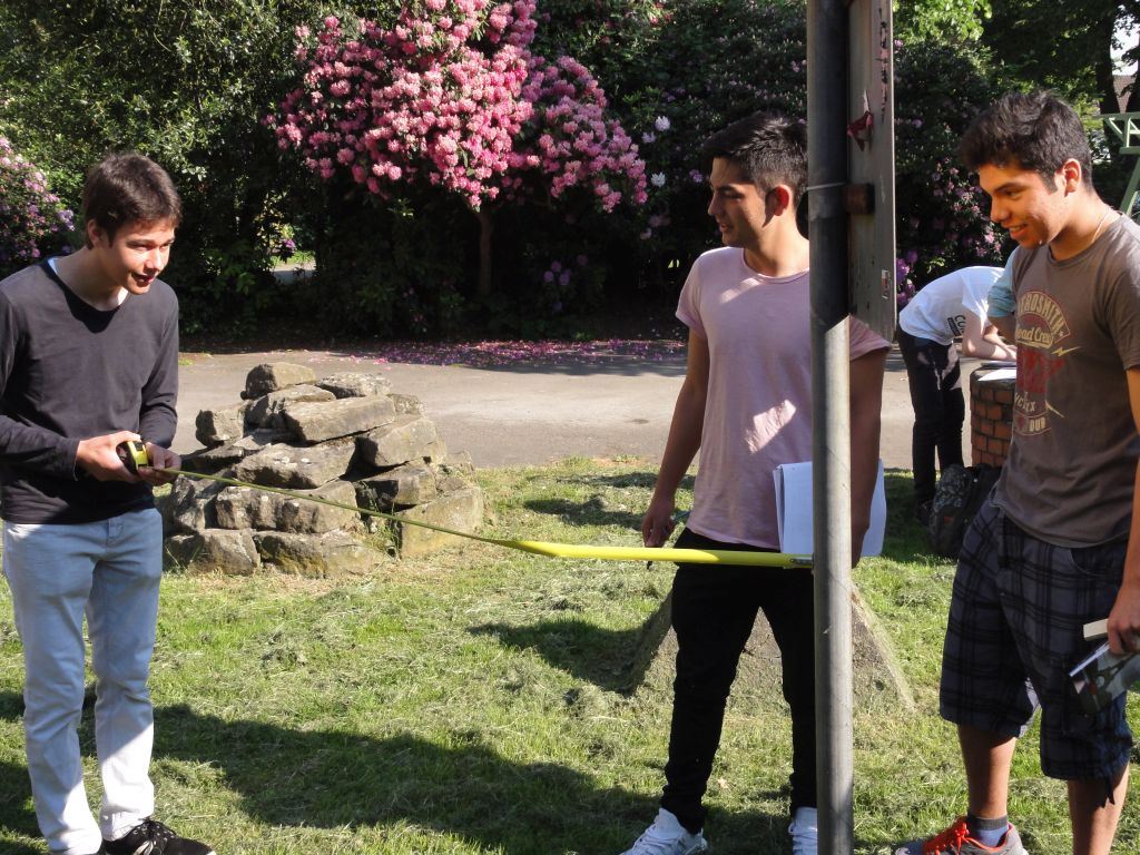 Mit vollem Körpereinsatz machten sich die Schülerinnen und Schüler der Klasse 9c in Kleingruppen am Mittwoch, 16.5.18, daran, den Turm der Goetheschule und andere interessante Objekte in der Umgebung mithilfe der Strahlensätze zu vermessen. Bei idealen äußeren Bedingungen konnten auch weitere traditionelle Techniken für Schätzungen und indirekte Messungen wie der Daumensprung oder das Försterdreieck ausprobiert werden.