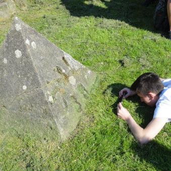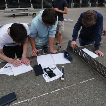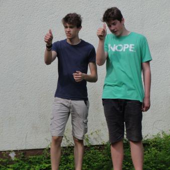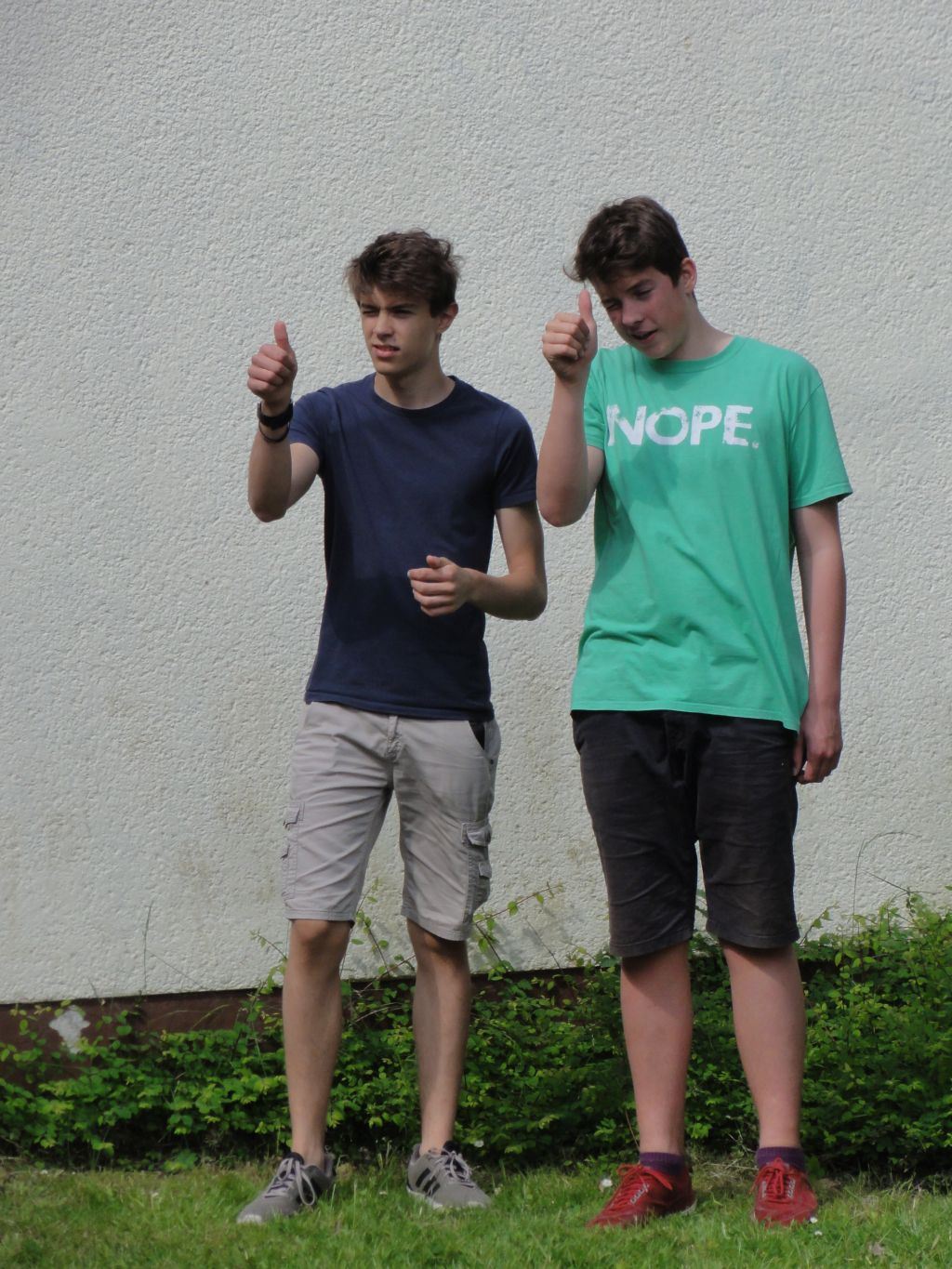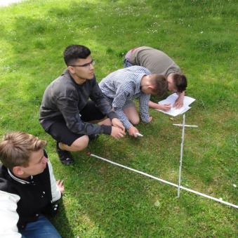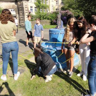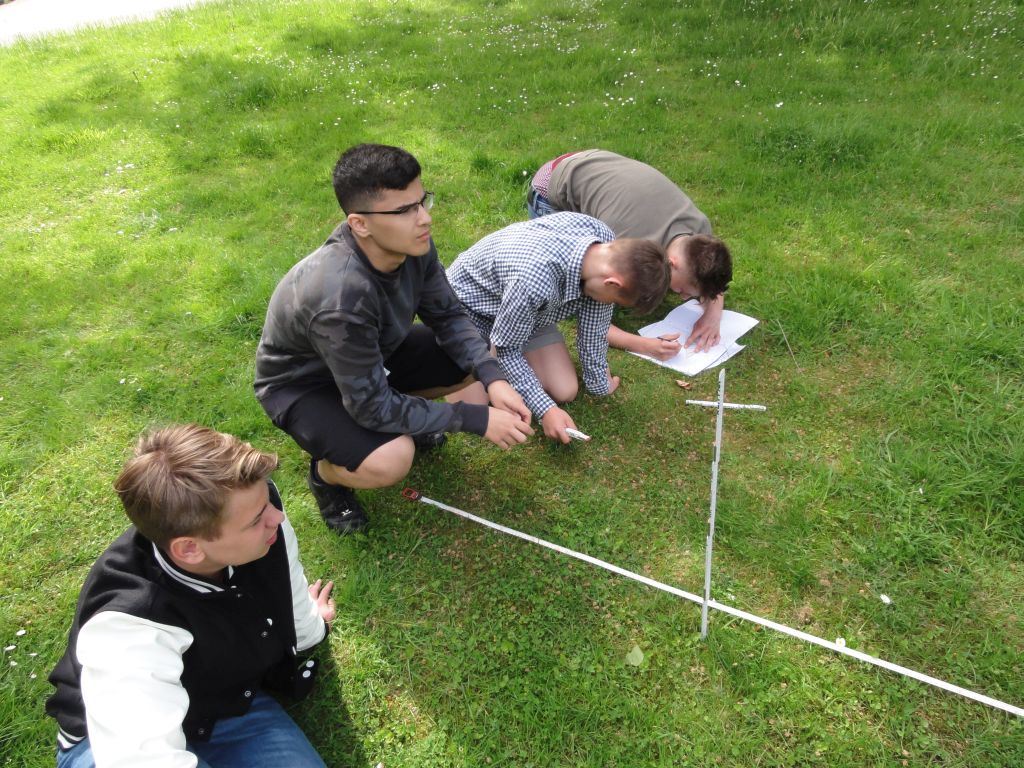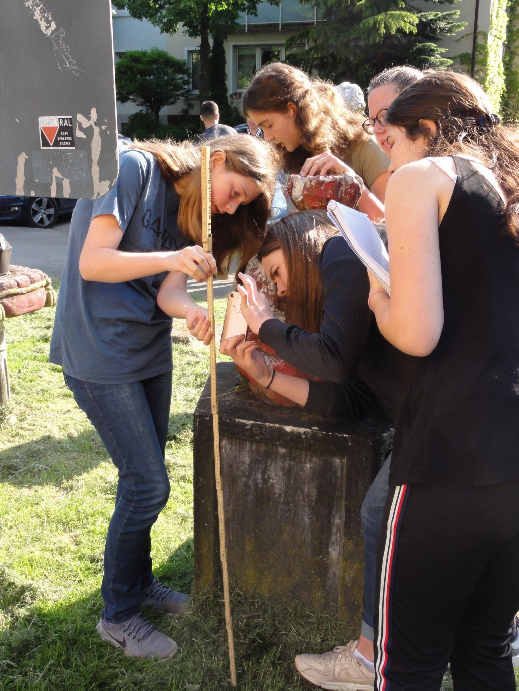 Mit vollem Körpereinsatz machten sich die Schülerinnen und Schüler der Klasse 9c in Kleingruppen am Mittwoch, 16.5.18, daran, den Turm der Goetheschule und andere interessante Objekte in der Umgebung mithilfe der Strahlensätze zu vermessen. Bei idealen äußeren Bedingungen konnten auch weitere traditionelle Techniken für Schätzungen und indirekte Messungen wie der Daumensprung oder das Försterdreieck ausprobiert werden.