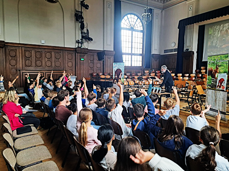 In einer lebendigen und mitreißenden Lesung nahm der Schriftsteller die Schülerinnen und Schüler mit in die fantastische Welt seiner Heldin Lena, die sich in ein Wehrhörnchen verwandelt und sich gemeinsam mit ihren Eichhörnchen-Freunden mutig gegen dunkle Mächte des Winters behaupten muss.
