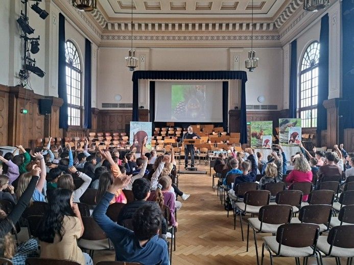Nach einer kurzen Begrüßung nahm Tom C. Winter das junge Publikum direkt mit hinter die Kulissen seines Buches. Mit Witz und Begeisterung erklärte er, welche überraschende Rolle Eichhörnchen in unserer Welt und in der Geschichte spielen – und gab einen packenden Überblick über die ersten Kapitel. Danach wurde es still in der Aula: Zwei fesselnde Kapitel las der Autor mit ausdrucksstarker Stimme vor und ließ die Abenteuer von Lena und ihren Freunden lebendig werden.