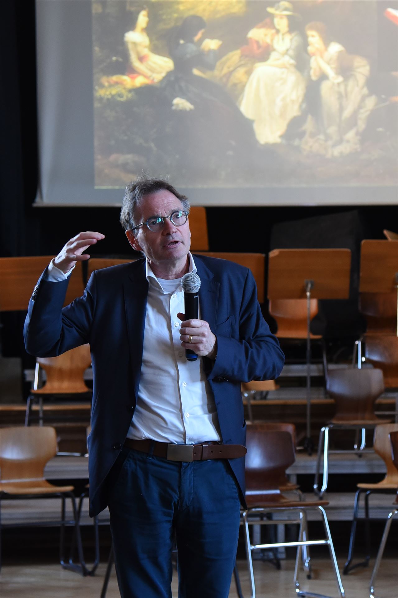 Am 19. März 2025 hatten die Schülerinnen und Schüler der Jahrgangsstufe 12 (Q2) der Goetheschule Essen erstmalig die Gelegenheit, an einem literaturwissenschaftlichen Vortrag teilzunehmen. In der Aula der Schule sprach Prof. Dr. Stefan Matuschek, Literaturwissenschaftler an der Universität Jena und Präsident des Vereins der Goethe-Gesellschaft in Weimar e. V., über Goethes bekannten Briefroman „Die Leiden des jungen Werthers“.