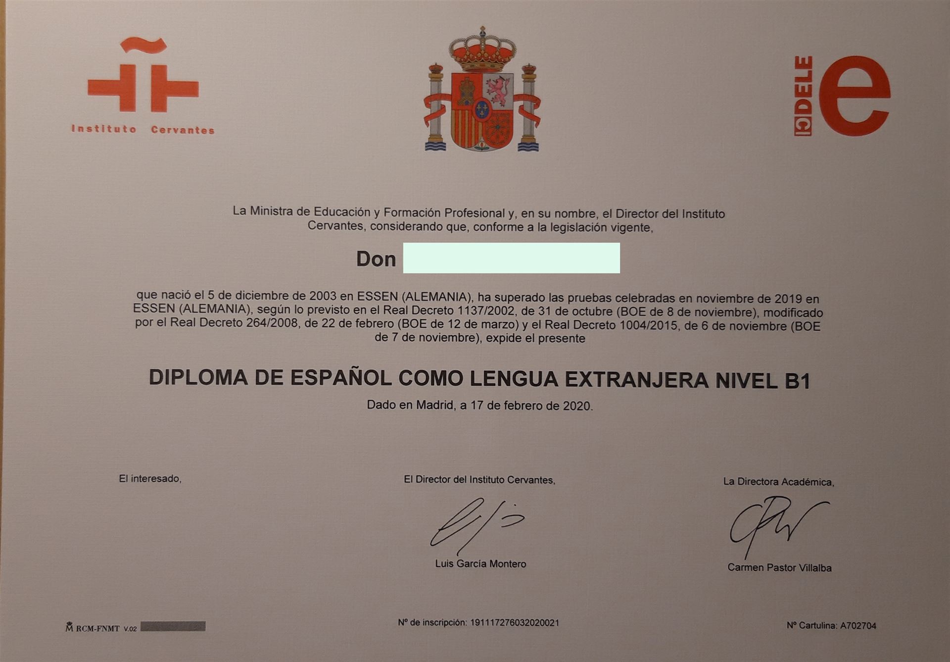 De todo corazón les felicitamos a Moritz Frankhof, Simon Lange, Julius Ruge, Felicia y Linda Schamuhn por haber aprobado los exámenes para conseguir el Diploma de espanol como lengua extranjera, un examen certificado por la Ministra de Eduación y Formación Profesional y, en su nombre, el Director del Instituto Cervantes en Madrid. Han alcanzado los niveles A2 y B1 según el Marco Común Europeo de Referencia para las lenguas en febrero de 2020 (fecha del certificado). Por problemas relacionados con la pandemia del Covid 19 se lo hemos podido entregar - por fin! - en el día de hoy (el 26 de noviembre de 2020).