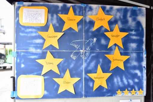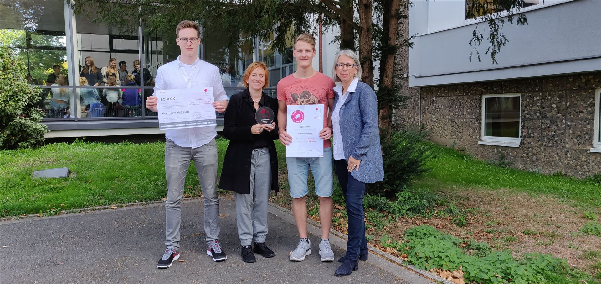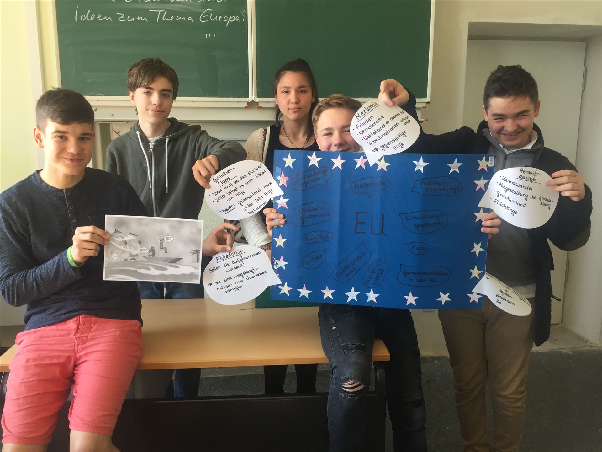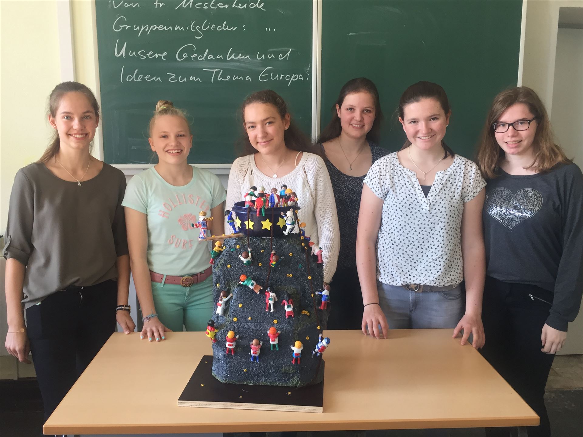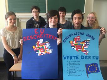 Die drei Klassen der Jahrgangsstufe 9 haben mit ihren im Politikunterricht von Frau Gwisdalla und Frau Mesterheide erstellten Beiträgen überaus erfolgreich am Wettbewerb der Stadt Essen teilgenommen. Zum Thema „Ey yoU – Was ist deine Meinung zur EU?“ wurden fleißig Plakate erstellt, Skulpturen angefertigt, Filme gedreht, Websites eingerichtet und Songs vertont. Diese Kreativität wurde auch in den Platzierungen deutlich, so konnten die Plätze 1- 7 und der 10. Platz belegt werden! Herzlichen Glückwunsch! Neben zahlreichen Geldpreisen wurde so auch eine Klassenreise nach Brüssel errungen, die die Schülerinnen und Schüler der Klasse 9a in der Jahrgangsstufe 10 antreten werden. Die feierliche Preisverleihung durch unseren Oberbürgermeister Thomas Kufen fand am 02.07. 2017 während der Veranstaltung der Initiative „Pulse of Europe“ auf dem Platz vor der Philharmonie Essen statt.