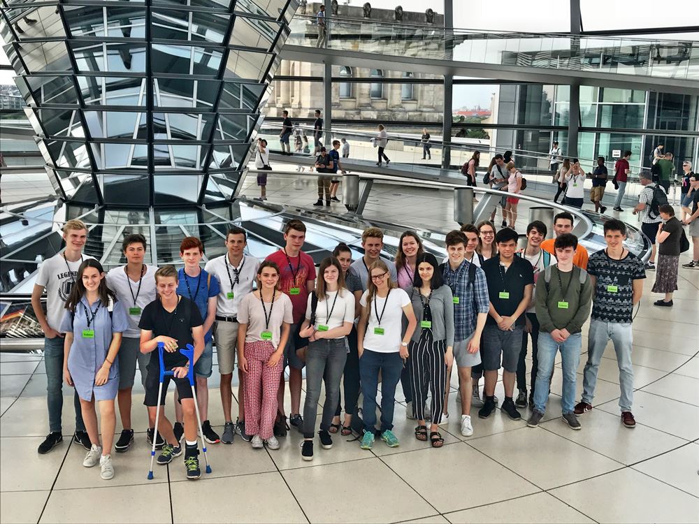 Auch in diesem Schuljahr machten sich einige Schülerinnen und Schüler der SW-Grundkurse der Q1 wieder auf den Weg nach Berlin, um unsere Hauptstadt unter geschichtlichen und sozialwissenschaftlichen Gesichtspunkten kennenzulernen. Eine Stadtführung, ein Besuch der Gedenkstätte Topographie des Terrors, des Holocaust Mahnmals, der Gedenkstätte Bernauer Straße, des Pergamon Panoramas und des Luftschutzbunkers Gesundbrunnen standen dabei genauso auf dem viertägigen Programm, wie politisches Kabarett in der Distel und ein Besuch des Bundestages und der Reichstagskuppel. Auch etwas Zeit für eigene Erkundungen und Freizeitvergnügen kamen nicht zu kurz. Berlin, wir kommen gerne wieder!