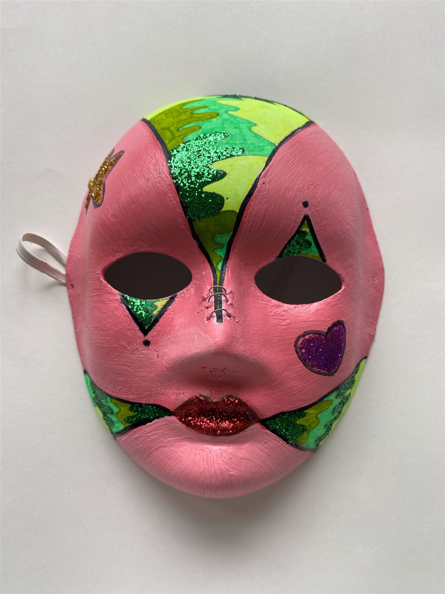 Material: Pappmaché Maske, Acrylfarbe, Heizkleber, Glitzer, UHU, Nieten, Ziersteine, Nadel und Faden, Fineliner, Edding
