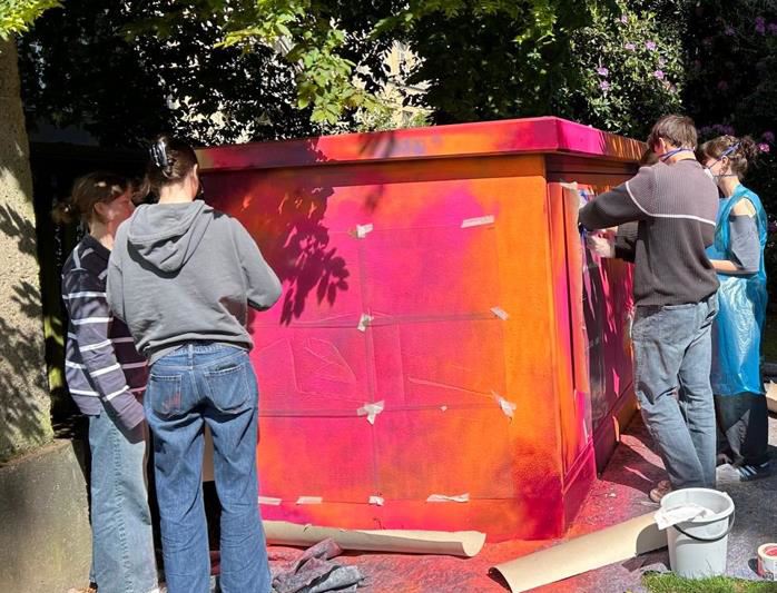 Das Wetter spielte an diesem Tag wunderbar mit, sodass die Farben schnell trockneten und Farbauftrag auf Farbauftrag zügig erfolgen konnte. Am Nachmittag waren dann alle Stationen fertig, die Gestaltung der Kästen wurde versiegelt und es wurde aufgeräumt.
