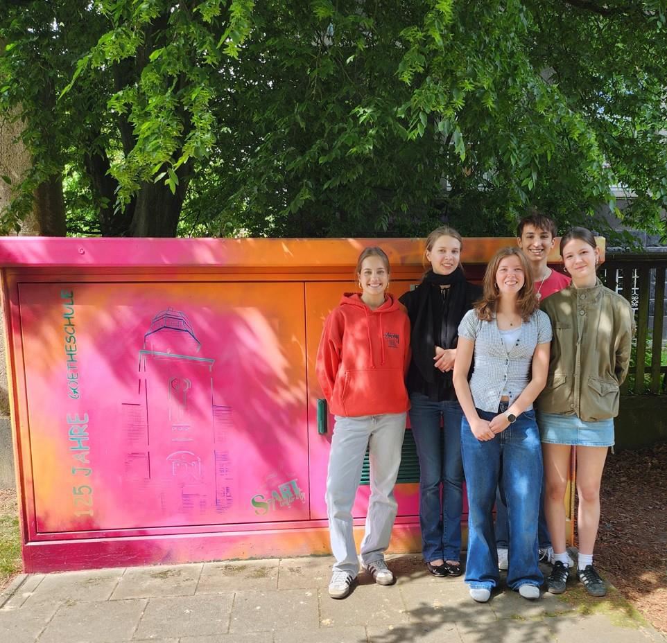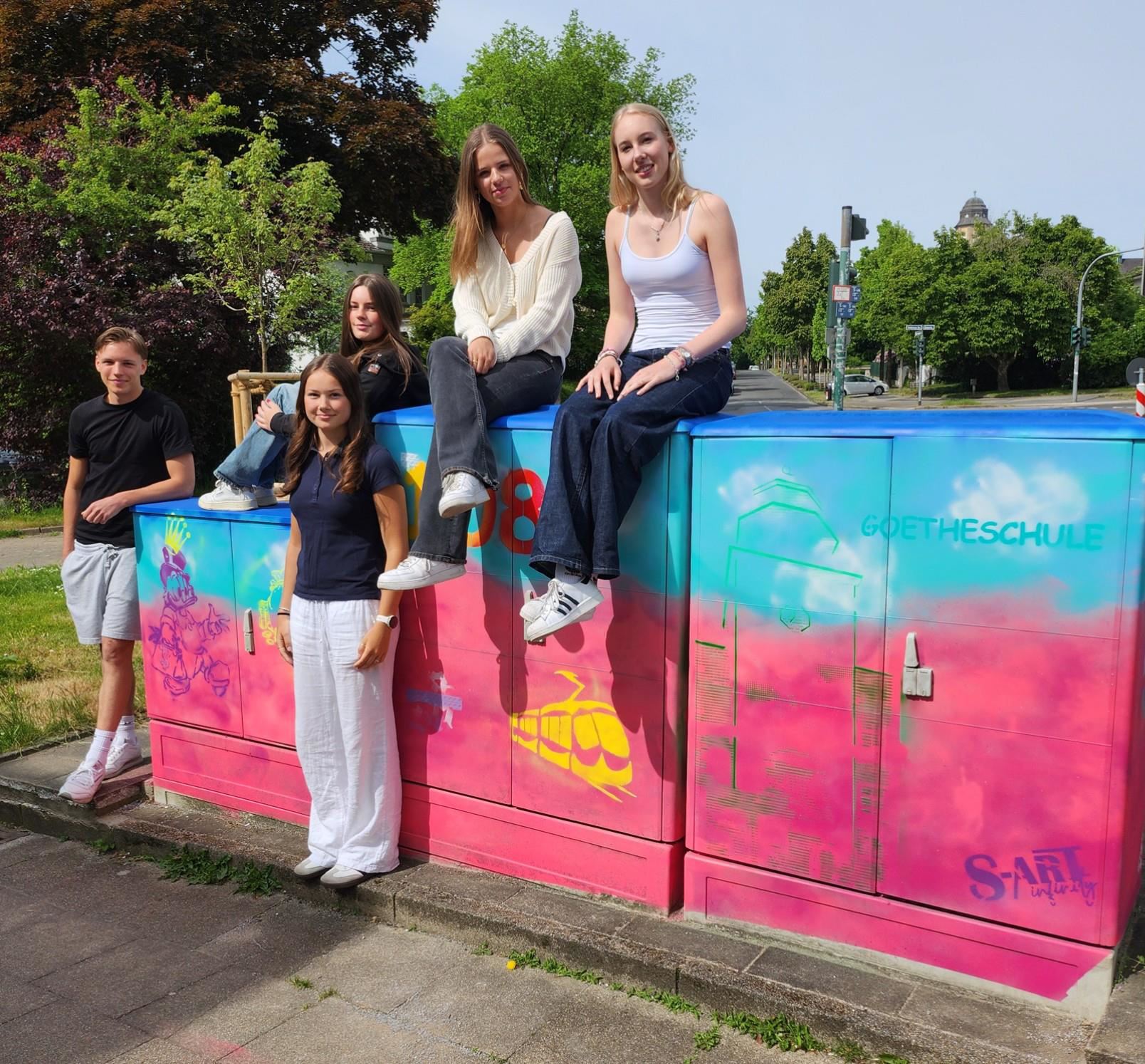 Einer der Kunstkurse der EF hatte Anfang Mai die Gelegenheit, Strom- und Trafokästen an unterschiedlichen Stationen in Bredeney zu gestalten. Angestoßen durch die Bredeneyer Werbegemeinschaft I love BRDNY, vertreten durch Frau Jürgensen und Frau Clauß, und in Zusammenarbeit mit dem Essener Künstler Sharyar Azhdari, der auch das Material zum Projekt spendete, entstanden farbenfrohe Graffitis auf den vormals eher unansehnlichen Verkleidungen der Strom- und Trafokästen vor der Goetheschule und entlang der Bredeneyer Straße.