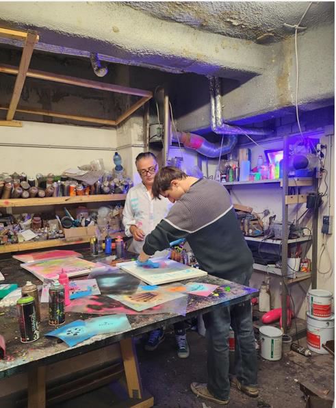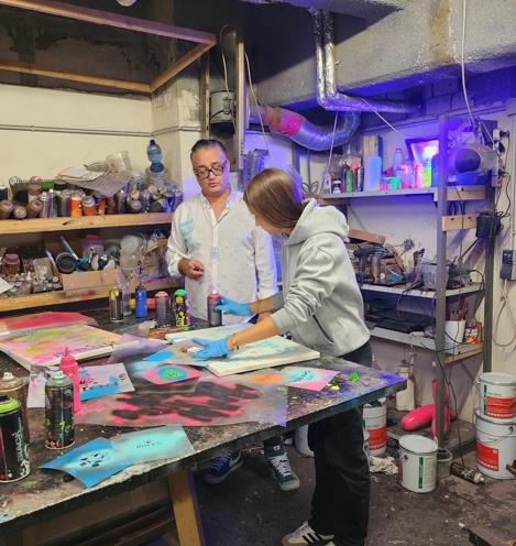 Am zweiten Tag des Projektes hatten die Schülerinnen und Schüler die Möglichkeit, im Atelier den Werkraum zu besuchen und gewannen einen Einblick in die Arbeitsweise des Künstlers. Shary erklärte den Gebrauch unterschiedlicher Farbspraydosen, mit mehr oder weniger Druck befüllt, sodass sich das Sprayverhalten verändert, und verschiedener dazugehöriger Caps. Die Caps, vielfach variierende Sprühköpfe für die Farbdosen, erlauben je nach Ausführung einen flächigen, breiten oder bis hin zu einem linear schmalen Farbauftrag für zum Beispiel Konturen. Es kann je nach Cap lediglich ein feiner Farbnebel verteilt oder gezielt großflächig gearbeitet werden. Sogar Caps, die in Form von Doppelherzchen sprühen, waren dabei. Unter fachkundiger Anleitung durfte jeder das Sprayen ausprobieren und die Arbeit mit einer Schablone üben. Schnell waren zum Abschluss des zweiten Tages Ideen gesammelt, was die einzelnen Stromkästen verzieren sollte und mit welchen Farben die Teams arbeiten wollten.
