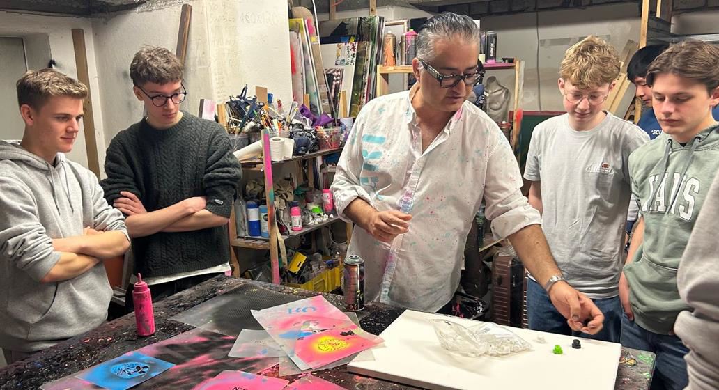 Das dreitägige Projekt startete an Tag 1 im Atelier und Ausstellungsraum des Künstlers Sharyar Azhdari mit einem ersten Kennenlernen, das sehr herzlich ausfiel, sodass aus Herrn Azhdari schnell Shary wurde, der bereitwillig erklärte und dem man alle möglichen Fragen zu seiner Arbeitsweise und zu seinen Arbeiten stellen konnte. Die Schülerinnen und Schüler hatten Gelegenheit, die dort ausgestellten Werke des Künstlers im wahrsten Sinne des Wortes zu begreifen, denn Anfassen war nicht nur erlaubt, sondern ausdrücklich erwünscht. Shary, der Collagen und Graffitis mit Acrylfarben, Farbe aus Spraydosen und Schablonen, Glitter und eingearbeiteten dreidimensionalen Werkstoffen erarbeitet, transportiert nicht nur ein visuelles, sondern auch ein haptisches Kunsterleben. Im Gespräch über seine Werke, Themenbereiche und Sujets, war er stets an den Aussagen der Schülerinnen und Schüler interessiert, forderte Kritik von ihnen und zeigte sich offen für deren Urteile. Interessant war es zudem, einen Künstler aus kurzer Distanz zu erleben, in seine Biografie und seinen Werdegang einzutauchen, sodass die Inhalte seiner Bilder nachvollziehbar wurden. „Helden meiner Jugend“, von Dagobert Duck über Bud Spencer bis hin zu Audrey Hepburn, oder „HeimaRt“, Werke, die Wahrzeichen von Essen oder des Ruhrgebiets aufgreifen und in die kleine Stücke Kohle aus der ehemaligen Zeche Zollverein eingearbeitet sind, illustrieren so auch Sharys eigene Geschichte, denn er ist selbst ein Essener Urgestein, aufgewachsen in Essen, unmittelbar neben der Zeche Zollverein.