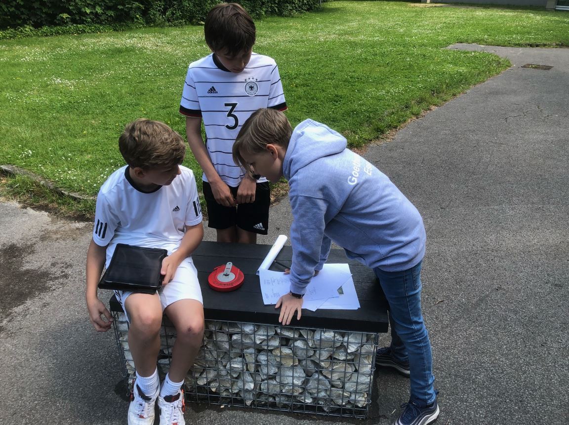 „Jaaaaaa!“ – Alle paar Minuten schallt ein lauter Jubelschrei aus einer anderen Ecke des Schulhofs, wieder hat eine Gruppe ein richtiges Ergebnis zu einer der sieben Aufgaben eingegeben. Am Donnerstag, 2. Juni, läuft die 5a in Kleingruppen über den Schulhof der Goetheschule zu verschiedenen Stationen, um sich dort mit ihrem bis zum Ende des 5. Schuljahres angehäuften Wissen in der Praxis zu beweisen. Die meisten sind in ihren Teams bestückt mit Maßbändern, Zollstock und einem iPad der Schule und stecken die Köpfe immer wieder zusammen, um die praktischen Aufgaben zu lösen.