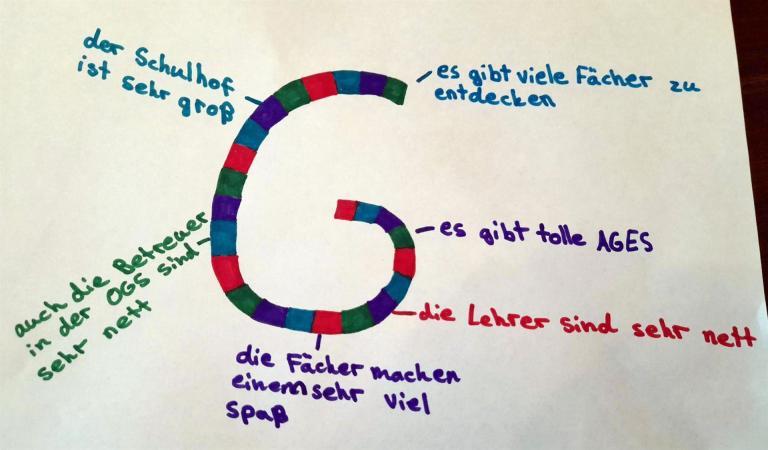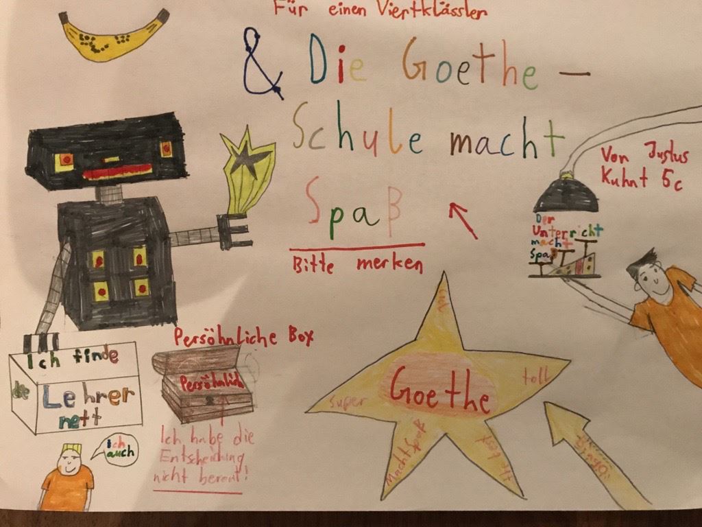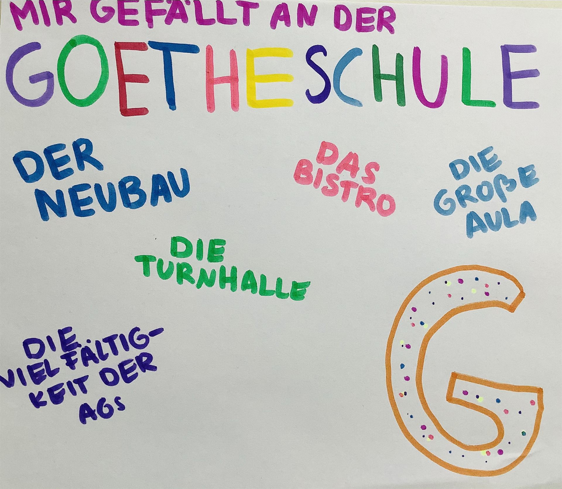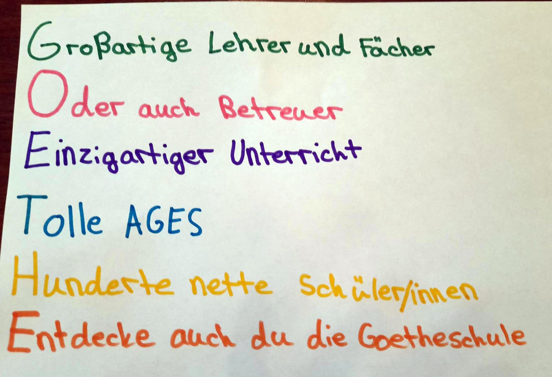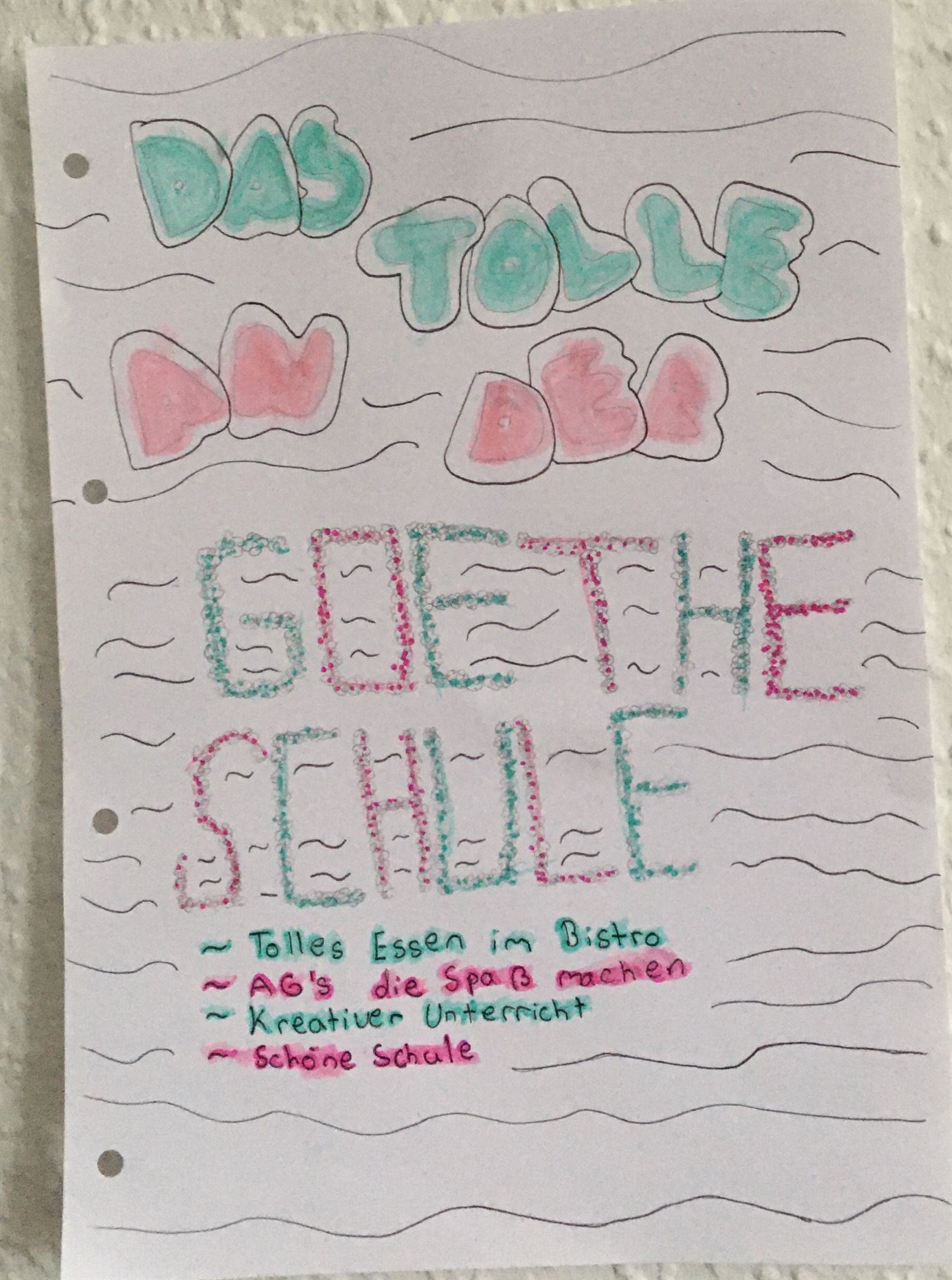 Meine ersten Tage auf der Goethe waren sehr spannend. Bei der Einschulung haben uns die Unterstufenkoordinatorin und die Schuldirektoren willkommen geheißen und natürlich auch unsere Klassenlehrer. Danach haben uns unsere Lehrer in unsere Klassen geführt. Dort habe ich meine Klasse kennen gelernt. Nach 2 Stunden war unser erster Tag auf der Goethe zu Ende und unsere Eltern haben uns abgeholt. Am nächsten Tag begann der richtige Unterricht mit tollen Fächern. Die neuen Fächer machen mir viel Spaß. In der ersten Sportunterrichtstunde haben wir etwas über Teamarbeit mit einem tollen Spiel gelernt. In Biologie haben wir auch schon mit Mikroskopen gearbeitet, das hat mir richtig viel Spaß gemacht. Außerdem gibt es ein tolles Bistro mit leckerem Essen. Ich bin auch noch im Chor, wo wir schon echt schöne Weihnachtslieder singen und am Ende des Jahres vor den Eltern auftreten. Mir gefällt der Chor ziemlich gut. Außerdem gibt es auch viele tolle AGs. Ich bin auch in der Zirkus-Ag, dort macht es mir großen Spaß.