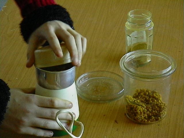 Eine reichhaltige Sammlung von geeigneten Stoffen wurde durch die Mitglieder der Kunst AG erstellt, so Schalen von Nüssen, Holzkohle, verschiedene Steinsorten, Kakao, Kaffeebohnen, Orangenschalen, getrocknete Blüten und Blätter, Gewürze wie Curry, Ingwer, Paprika, Safran, Senfkörner, Zimt, Mohn, die mit Kaffeemühlen und Mörsern gemahlen wurden. Tee wurde gekocht, Fruchtsäfte gepresst, getrocknete Gemüse wie Mais, verschiedenfarbige Linsen und Erbsen gemahlen. Rotkohlsaft, Traubensaft, Holunderbeeren, Möhren, gekochter Saft von roten und brauen Zwiebelschalen ergänzten die Auswahl farbiger Stoffe.