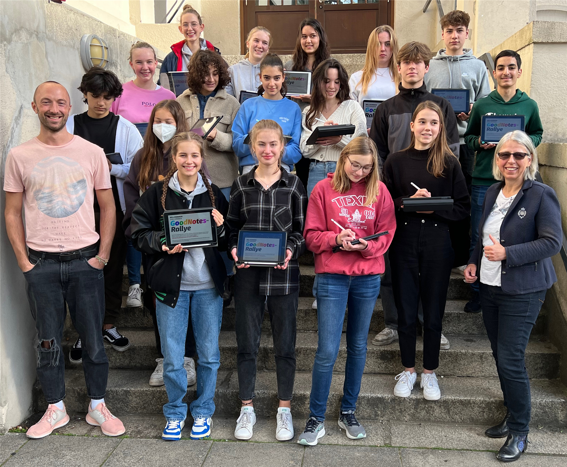 Alle Schülerinnen und Schüler bekommen in den ersten Schulwochen ein I-Pad inklusive Hülle, Tastatur und Stift. An sogenannten IPad-Tagen in diesem Zeitraum erhalten dann alle Schülerinnen und Schüler ihre managed-Apple-IDs, werden ins WLan gebracht, erhalten eine Grundschulung in der IPad-Nutzung und eine Einführung in GoodNotes. Die gesamte 5. Jahrgangsstufe wird dabei von Klassenleitungen, dem Digital-Team und älteren Schülerinnen und Schülern in Workshops gecoacht. Dass diese Ausbildungen durch Schülerinnen und Schüler der Goetheschule für die neuen 5. Klassen gehalten werden, ist für uns von besonderer Bedeutung und ein schönes Beispiel für gemeinsames Lernen. Wir freuen uns darüber, dass die älteren Schülerinnen und Schüler ihr Wissen an die Jüngeren weitergeben.