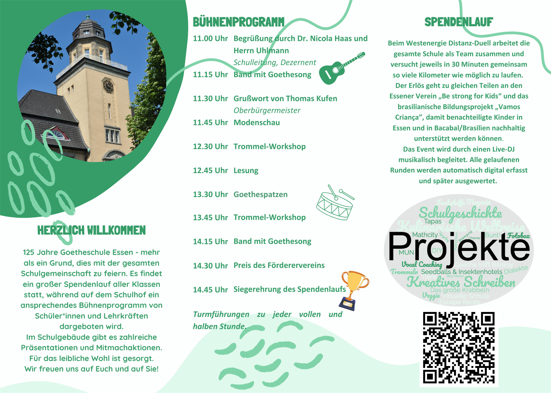 Dieser Lauf ist zugleich ein Spendenlauf, bei dem die Projekte „Be strong for Kids“ und „Vamos Crianca“ unterstützt werden. Seit Jahren ist diese Hilfe für benachteiligte Kinder in Essen und Brasilien fester Bestandteil des Schulprogramms der Goetheschule. Einer der katholischen Religionskurse der Jahrgangsstufe Q2 hatte bereits im Vorfeld des Laufes Sponsorenzettel erstellt und für den Spendenlauf geworben. Alle weiteren eingenommenen Spenden während des Schulfests wurden ebenfalls an die beiden Projekte weitergeleitet.