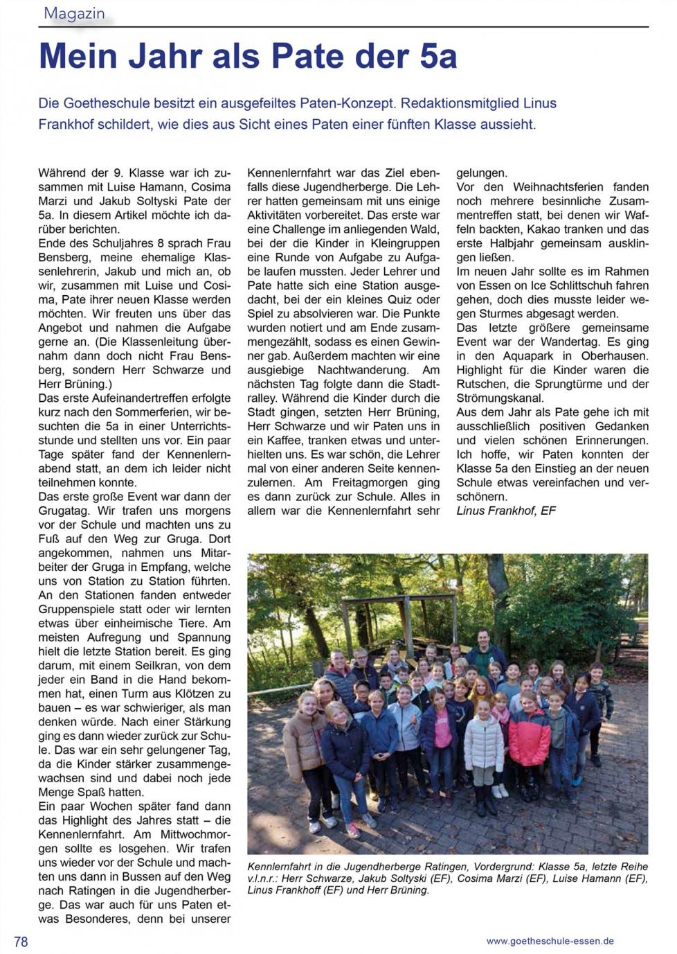 Eine neue Schule zu besuchen, sich zurecht zu finden, sich neue Namen, neue Fächer, Fachräume zu merken, sich an veränderte Stunden- und Pausenzeiten zu gewöhnen, sich in der Schule, die so viel größer als die ehemalige Grundschule ist, zu orientieren, ist einerseits positiv aufregend, aber auch anstrengend. Um den neuen Fünftklässlern den Einstieg in den Schulalltag an der Goetheschule zu erleichtern, wird jede der 5. Klassen von 4 Paten, Schülerinnen und Schüler der Oberstufe, begleitet.