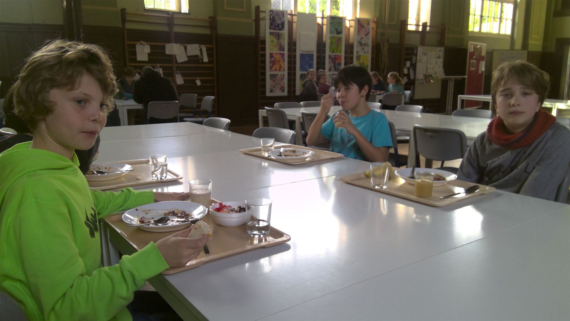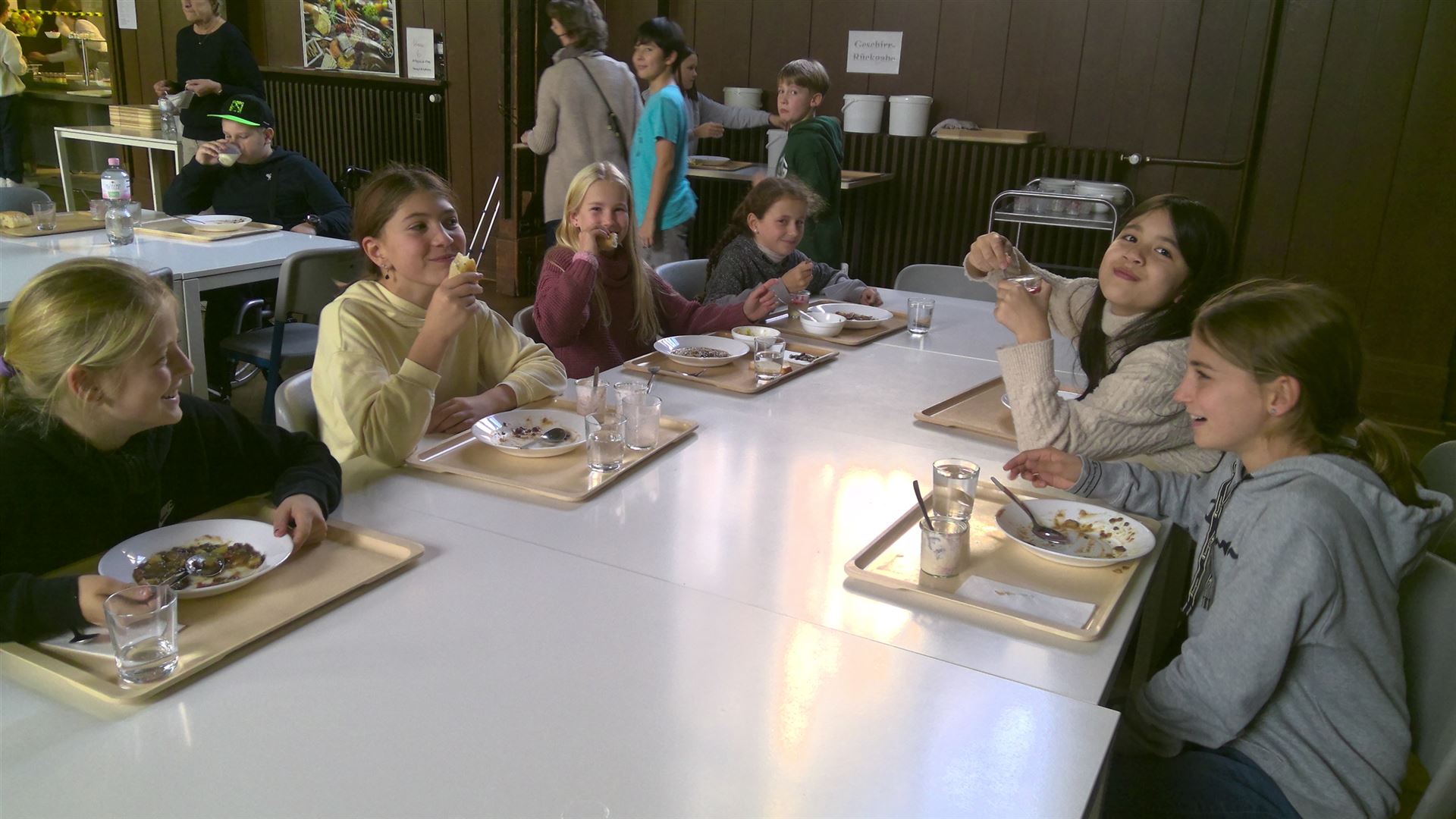 Für unsere Neuen, die Fünftklässler, wird in den Pausen und für die Betreuungskinder der Erprobungsstufe zum Mittagessen eine separate Reihe zum Anstellen am Verkaufstresen eingerichtet und die Fünftklässler dürfen zu Pausenzeiten sogar den Unterricht 5 Minuten früher verlassen, damit auch sie schnell merken, dass nicht gedrängelt werden muss, sondern alles seine Ordnung hat.