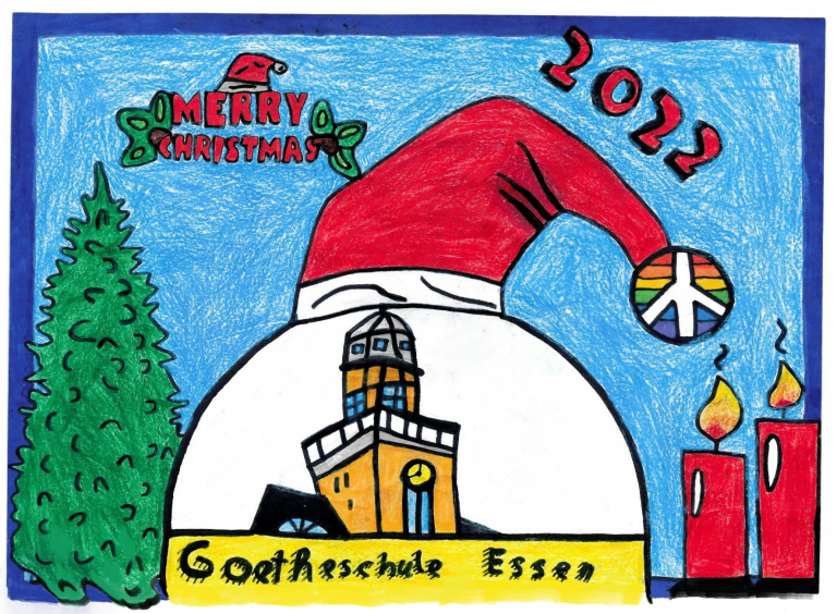 Für die 5. Klassen ist die Vorweihnachtszeit jedes Jahr der spannende Auftakt zu einem jährlichen Wettbewerb. Es gilt für die Fünftklässler das Bild der Weihnachtskarte der Goetheschule zu gestalten, die bis weit über die Grenzen Essens hinaus verschickt wird. Bis Anfang Dezember kommen dutzende Werke der jungen Künstlerinnen und Künstler in der Verwaltung an. Es kann gezeichnet, gemalt, geklebt werden, der Kreativität sind keine Grenzen gesetzt. Beliebte Motive sind immer wieder ganz weihnachtlich angeregt der geschmückte Tannenbaum, Wichtel oder der Rentierschlitten mit dem Weihnachtsmann. Unangefochten führt jedoch das weihnachtlich geschmückte Schulgebäude die Liste aller kreativen Ausführungen an. Die Goetheschule im festlichen Glanz, das Schulgebäude in einer Schneekugel oder gar als Lebkuchenhaus. Unverkennbar aber immer wieder auch das Schulwahrzeichen, der Turm, mal als Landeplatz für den Weihnachtsmann, mal ganz schlicht mit Weihnachtsmütze.