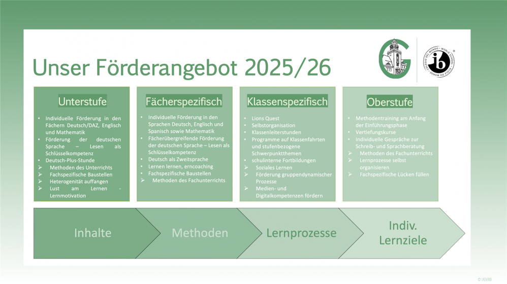 Individuelle Förderung heißt, Interessen vertiefen, aber auch Schwächen aufholen. Alle interessierten Schülerinnen und Schüler, die an den Einzelprogrammen teilnehmen wollen, melden sich persönlich bei den in dieser Übersicht aufgeführten Lehrkräften, um gemeinsame Vereinbarungen über das konkrete Förderprogramm und das Modell (z.B. Blockmodell) zu treffen.